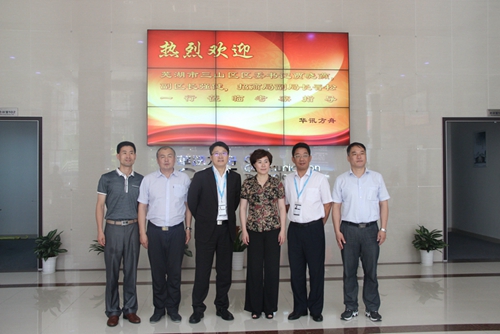 7月17日,蕪湖市三山區區委書記賈曉燕,副區長強健,招商局副局長晉松一行前來華訊參觀考察。總裁趙術開、副總裁唐永健、總裁辦主任范叢明等領導出面予以接待。 本次考察