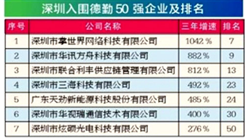 頒獎(jiǎng)典禮在深圳舉行。深圳地區(qū)有7家企業(yè)上榜,華訊方舟位列第9,其三年增長(zhǎng)率高達(dá)882%。